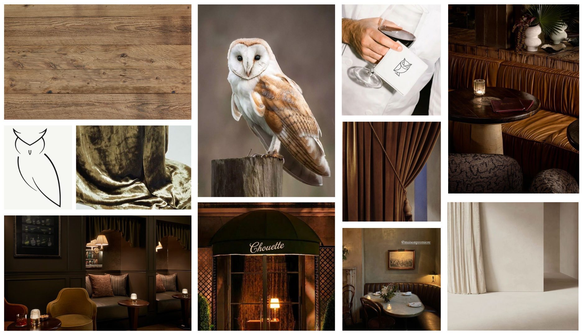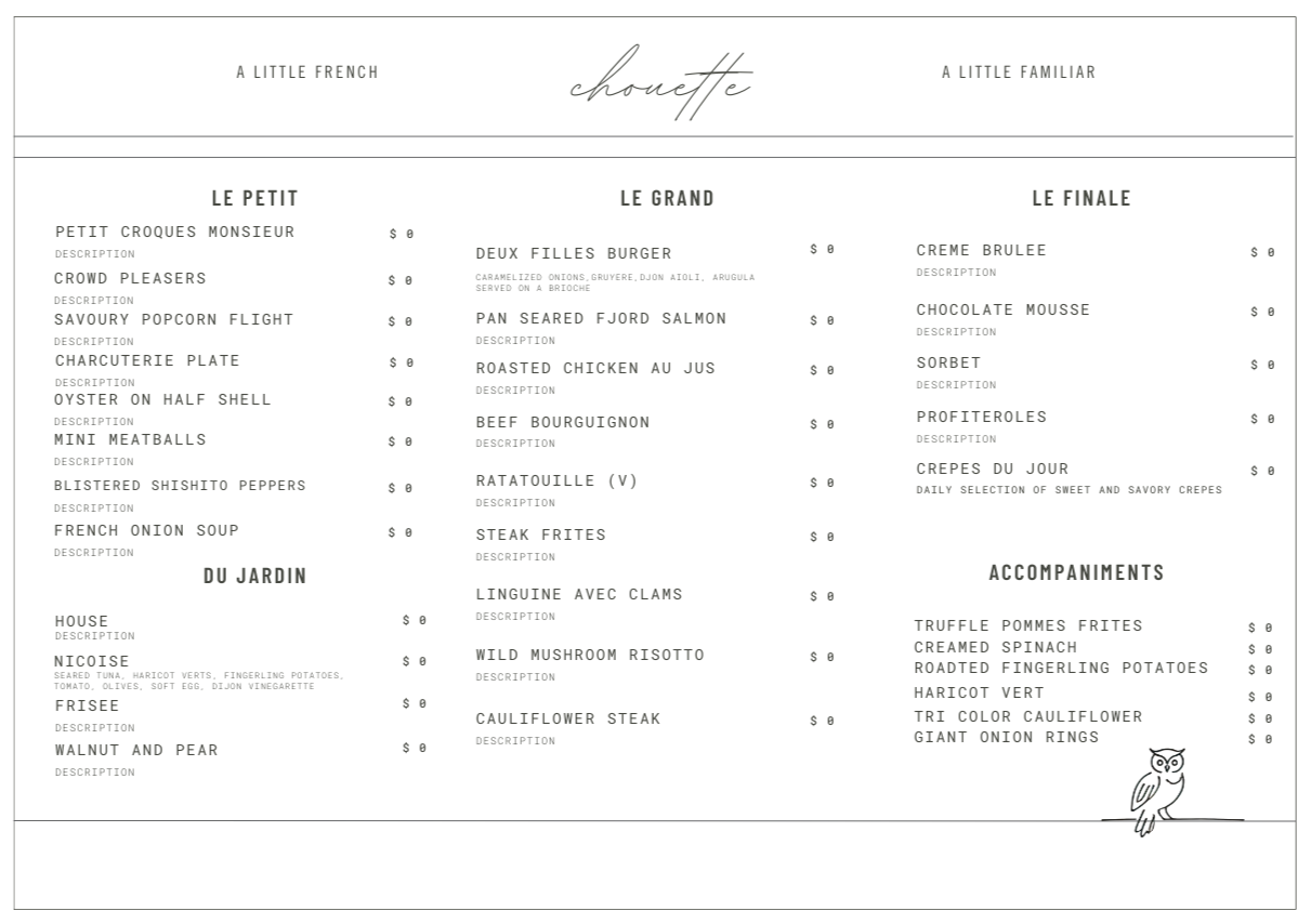 Chouette is a French-inspired bistro concept that celebrates both sophistication and ease. The name, meaning “owl” in French and also used as slang for “cool” or “nice,” creates a dual identity—visually refined yet spirited and approachable. Inspired by the convivial energy of traditional Parisian cafés, Chouette is designed as a place where good food, conversation, and atmosphere come together to create an experience that feels both elevated and effortlessly welcoming.